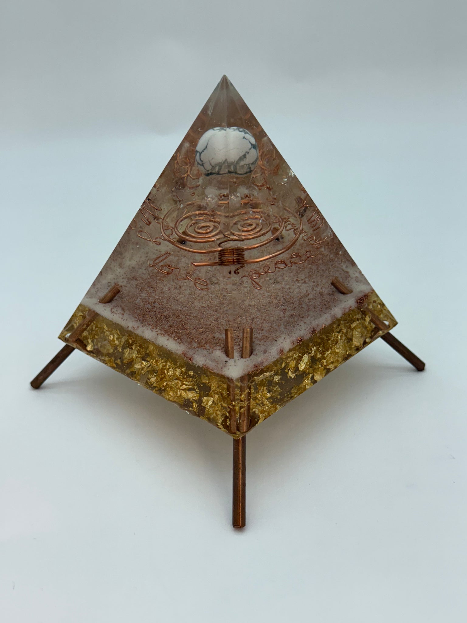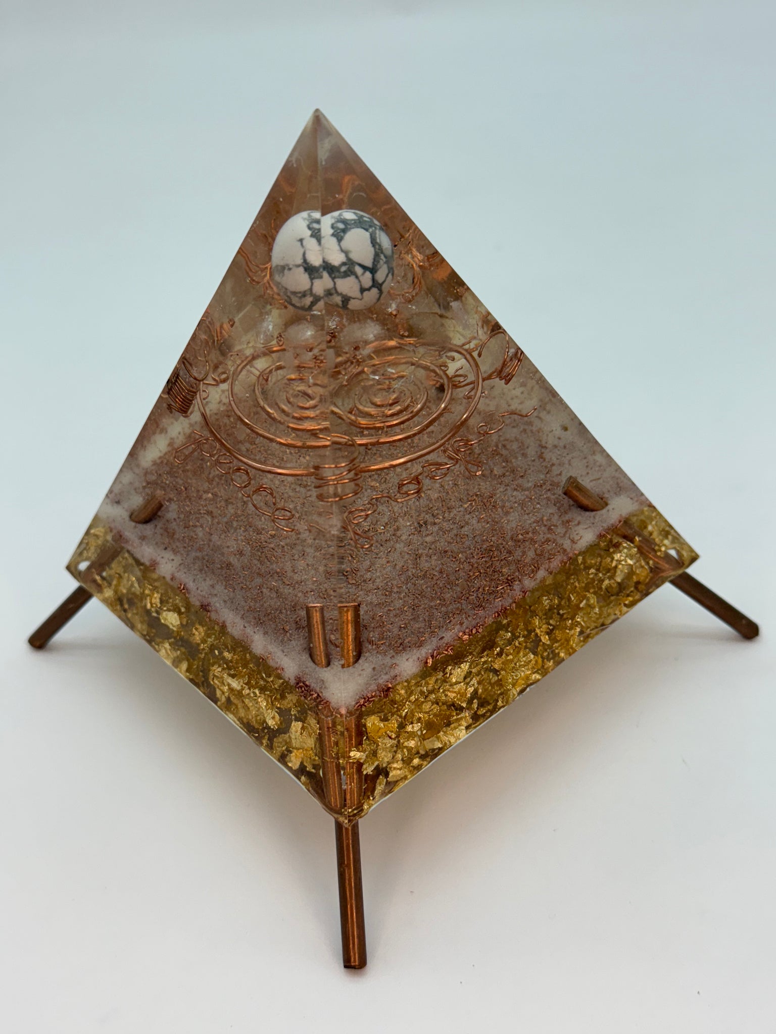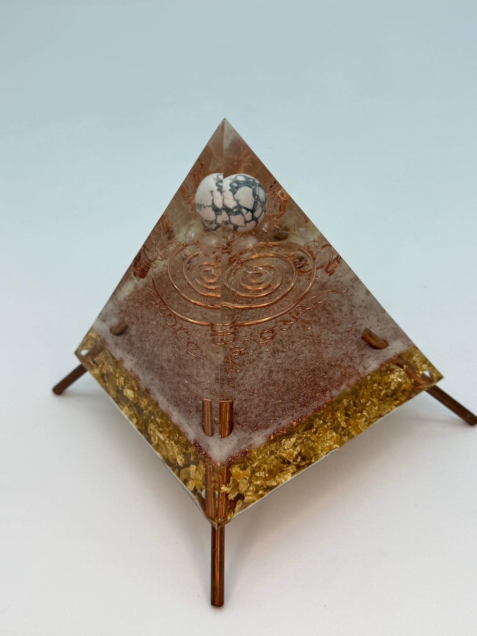 At the peak rests a howlite sphere, a stone known for its calming, clarifying, and emotionally soothing qualities. Its presence encourages peaceful awareness and inner spaciousness, creating an aligned foundation for growth and abundance to flow.