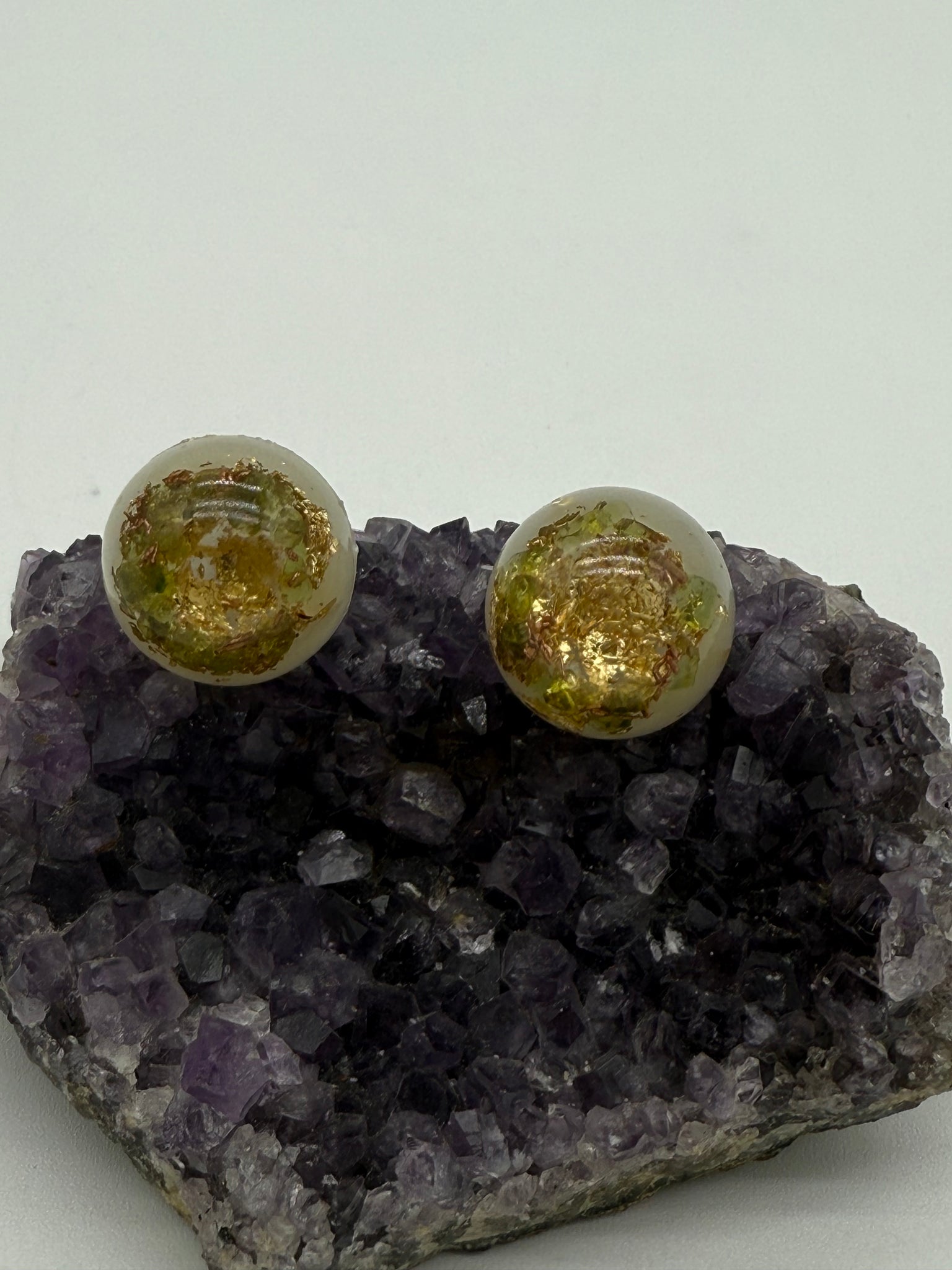 Each pair features a harmonious blend of clear quartz, peridot, copper, and gold flakes artfully layered in radiant resin to create a field of vibrant equilibrium and flow.